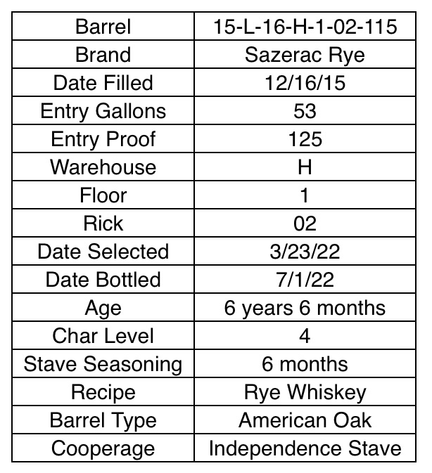 I always send pictures of the laser code and medallion to info@buffalotrace.com to get the specific details of all the Buffalo Trace single barrels I purchase. The laser codes can tell you a lot by themselves. My article How to Read a Buffalo Trace Laser Code goes into detail of all the information you can get from the code.